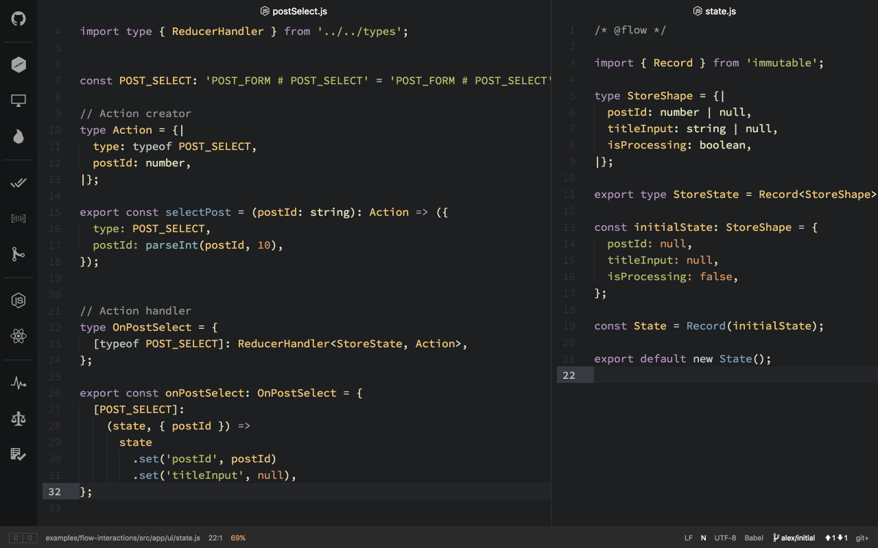 One additional benefit here is the ability to accurately type Redux parts with Flow. Thanks to Atom, I can view Flow errors in the real-time in my editor. And thanks to Nuclide for superior Flow integration.